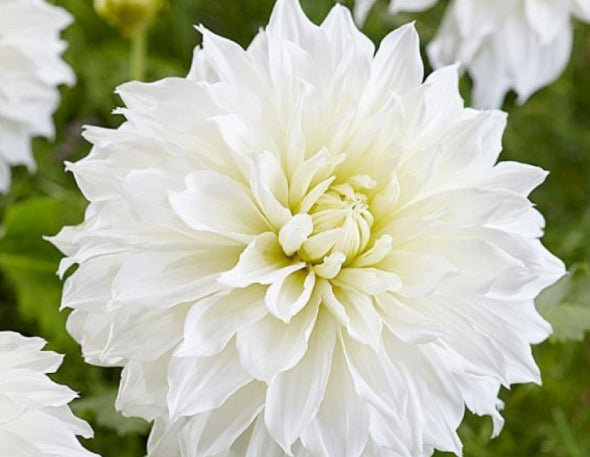 10" of snow-white blooms with a touch of cream in their centers. This dinnerplate has flat, disk.shaped blooms.